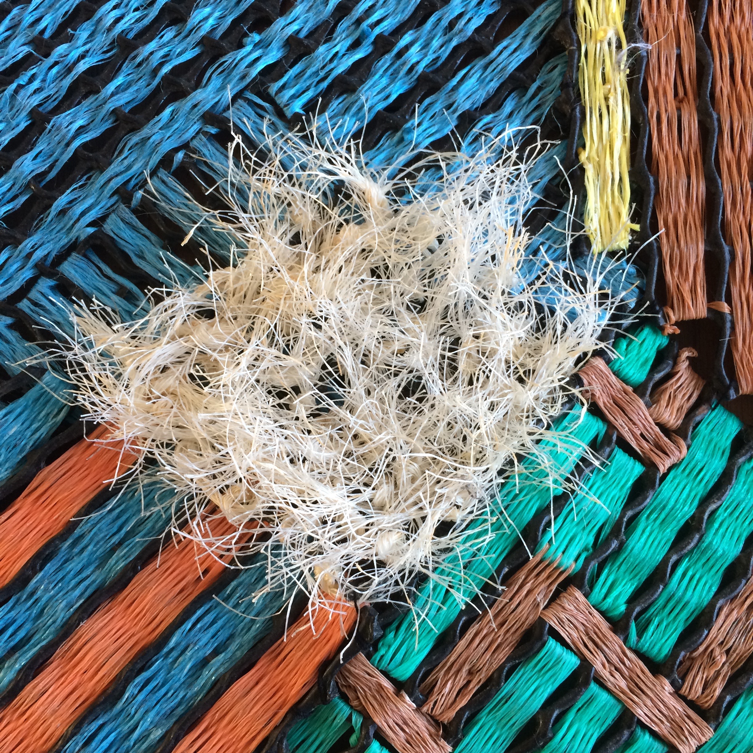 Certains de mes tissages sont faits sur des poches de huitres qui sont, hélas, aussi fabriqués en plastique. Elles sont particulièrement présentes dans les régions ostréicoles de France (Bretagne, Vendée, Normandie).